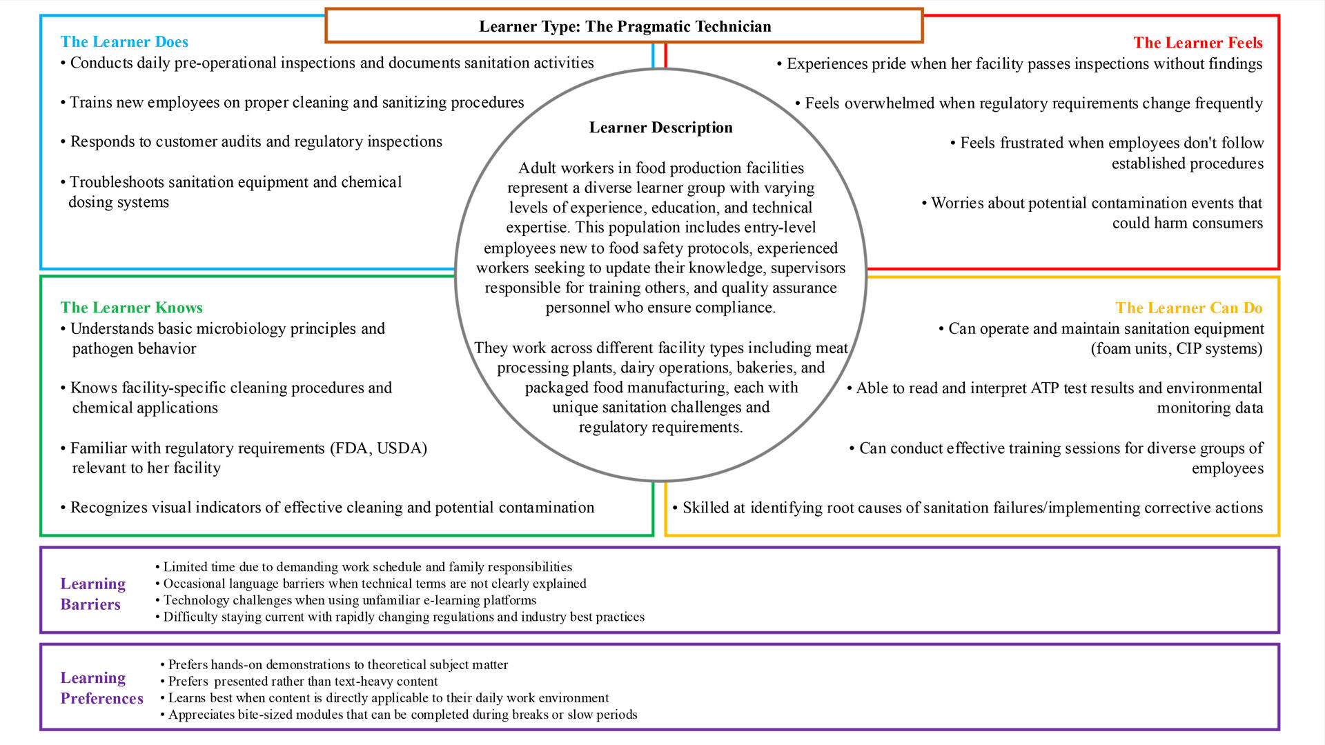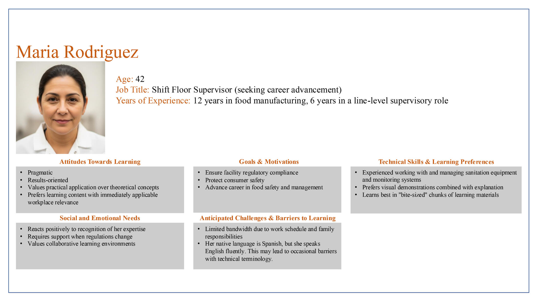 A LEARNER-CENTERED APPROACHThe entire project was grounded in a deep, empathetic understanding of the end-user, developed from over 14 years of direct industry analysis and client interviews. This research was synthesized into our core persona:Maria Rodriguez, the "Pragmatic Technician"Maria represents the skilled, hands-on professional common in high-compliance fields—from food safety to aerospace. Designing for her meant focusing on these core attributes:Immediate Applicability: She values practical, task-oriented training that is directly relevant to her daily work environment.Visual Demonstration: She prefers hands-on and presented content over dense, text-heavy materials.Efficiency: With a demanding work schedule, she needs flexible, "bite-sized" training modules that respect her limited time.